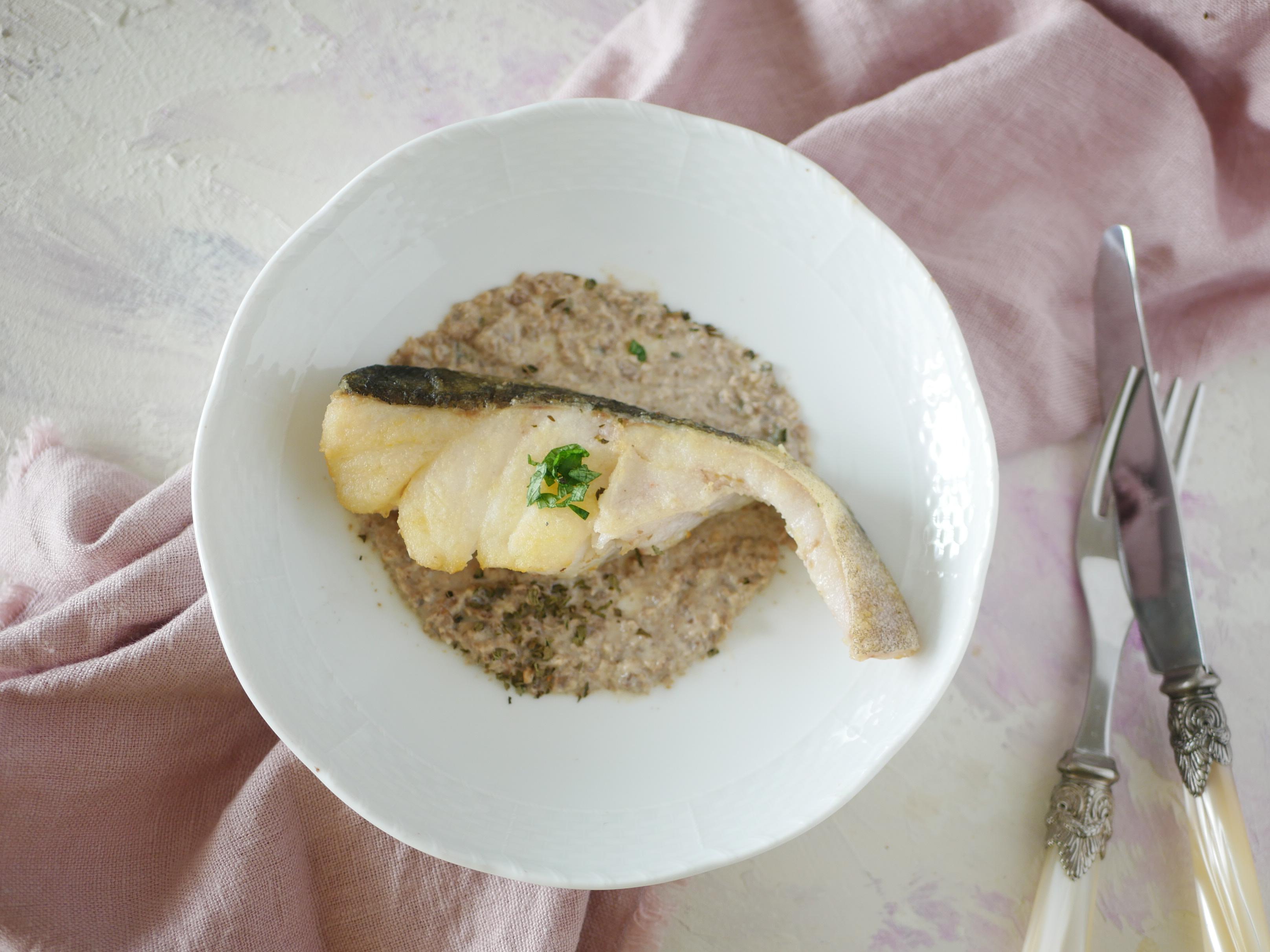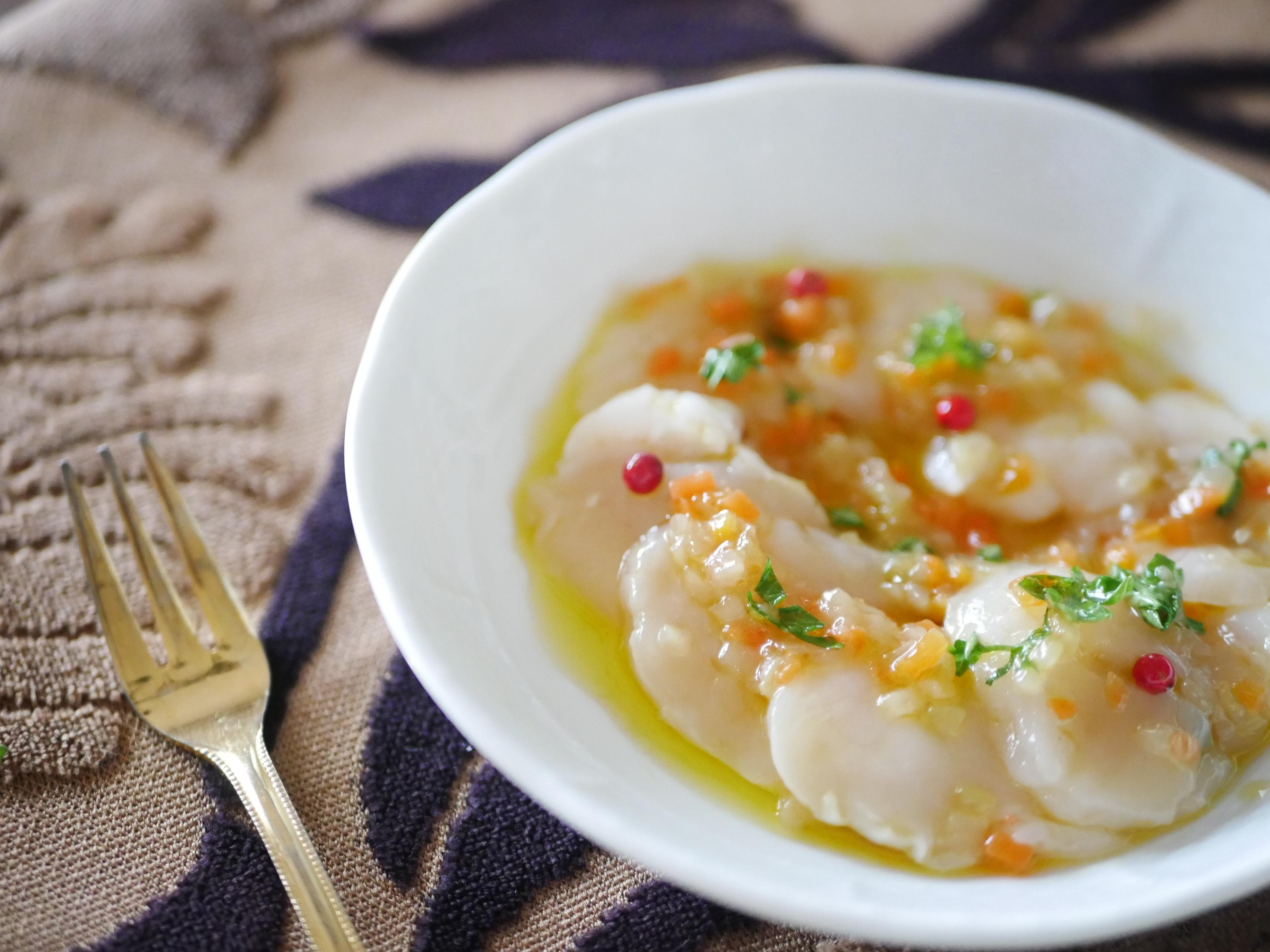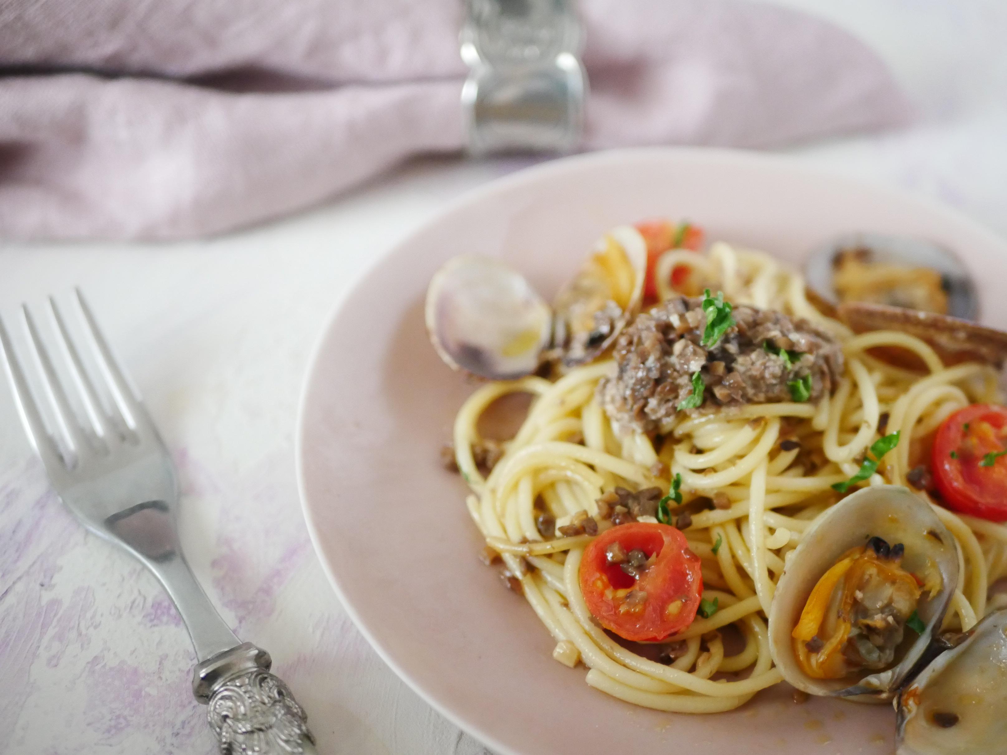 ③ 塩水で茹でたパスタと②を合わせ、オイルや茹で汁で味を調整して皿に盛る
