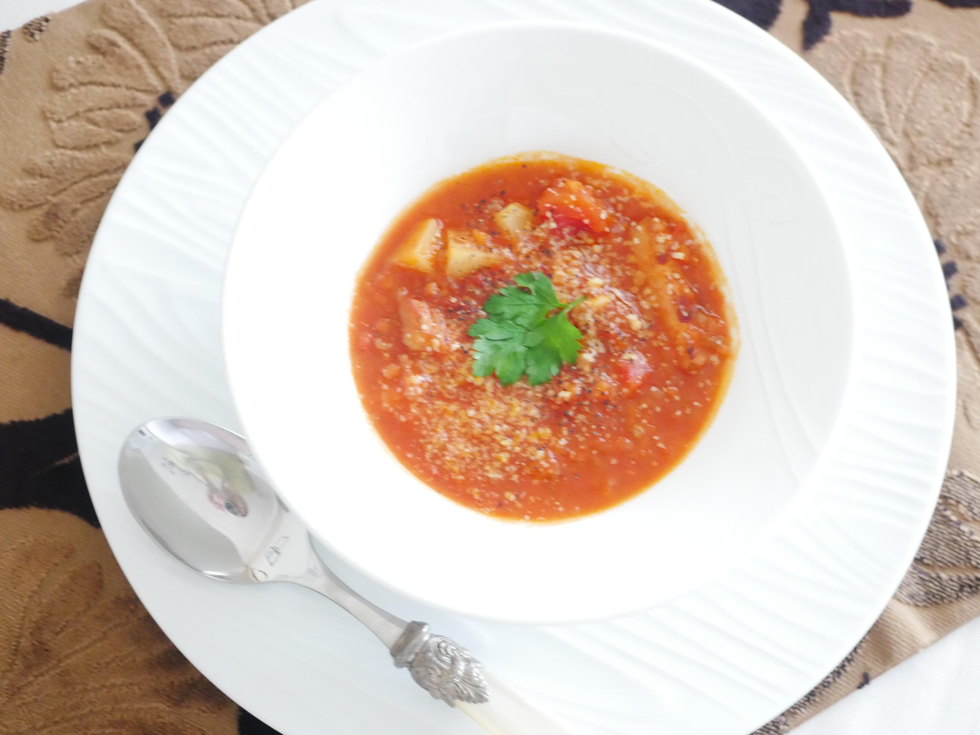 ③同じ鍋に殻を加えて香ばしく炒め、白ワインと水、玉ねぎ、セロリ、トマトペーストを加えて半分程になるまで煮詰め、ザルで濾す。