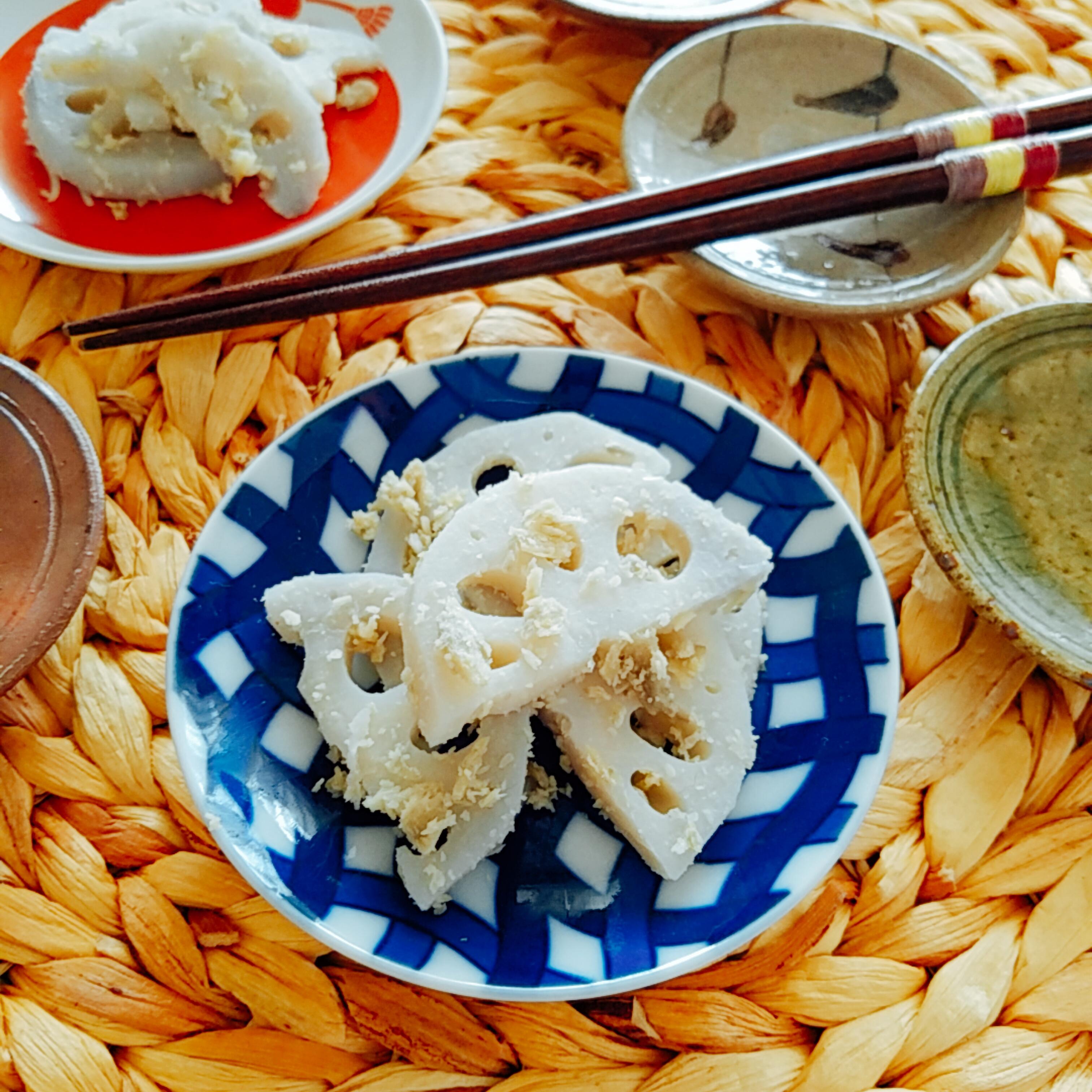 ①フライドごぼうをすり鉢ですり、醤油と砂糖と混ぜる。