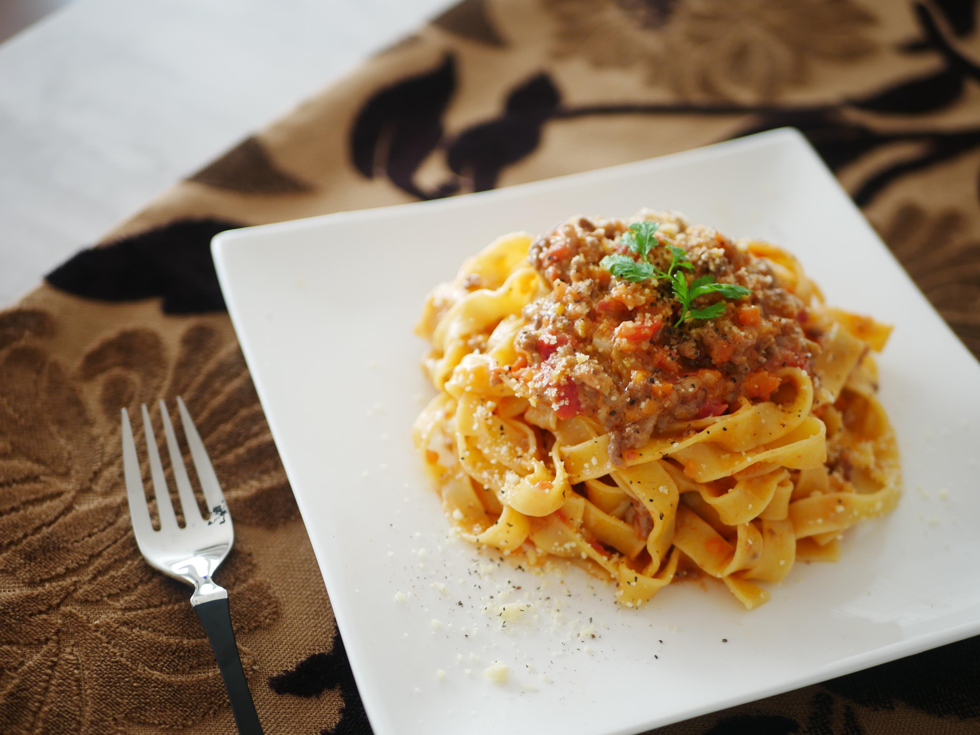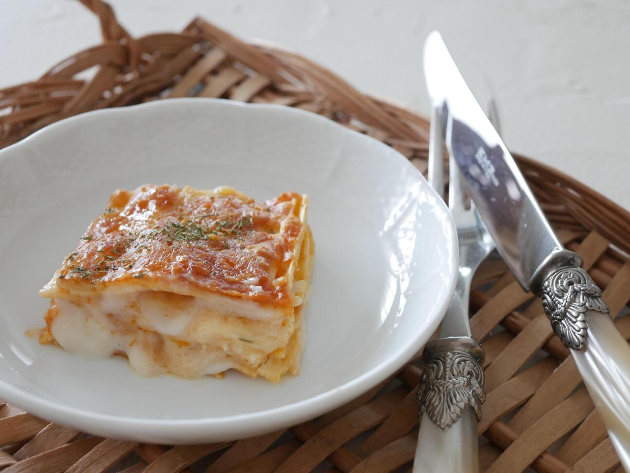 ②器にバターを塗り、ラザニアとホワイトソース、ミートソースを服にして入れて一番上にチーズをのせる。