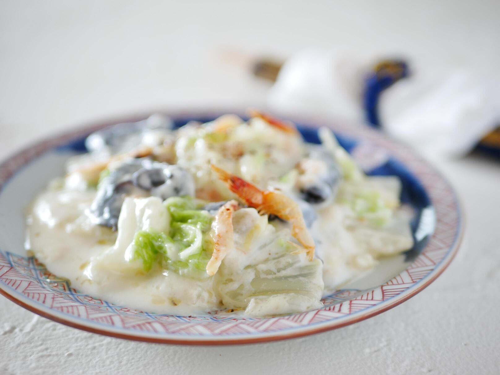 ③香りが出てきたら白菜とキクラゲを加えて炒める。ホワイトソースを加え、塩で味を整える。
