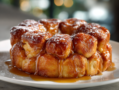 別名ちぎりパンともいいます。一口サイズの生地にキャラメルソースを絡めクグロフ型に敷き詰めて焼きます。粗熱がとれたらクグロフの凹みにキャラメルペーストとラムレーズンを注ぎます。キャラメリゼされた香ばしさとほろ苦さがあと引く美味しさです。