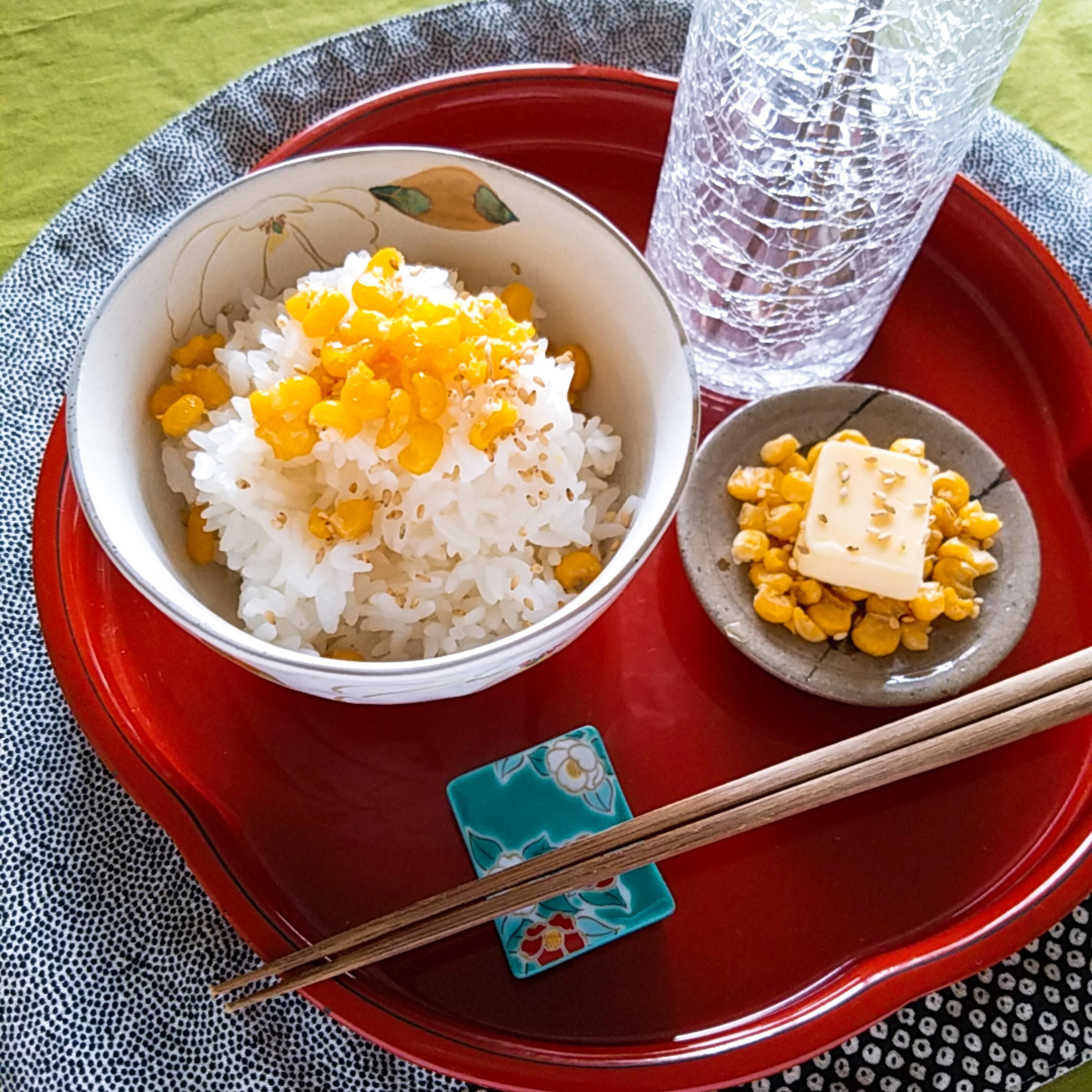 ②その上にフライドコーンと白ごまを混ぜたものをのせる