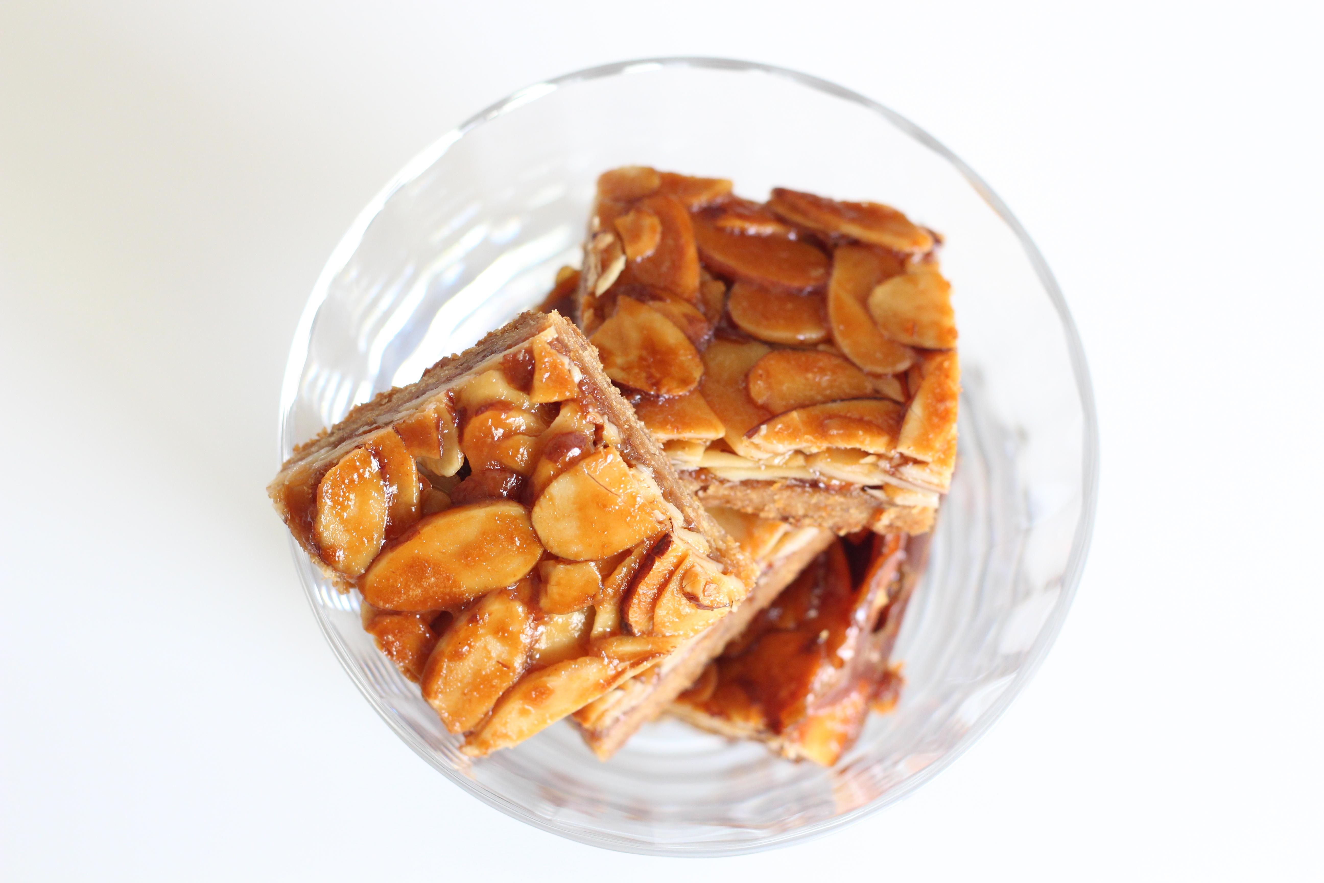 サブレ生地にキャラメルソースでコーティングしたナッツ類を乗せて焼き上げたフランス菓子。本来、ローストアーモンドと牛乳、砂糖、バターなどで作るキャラメルアーモンドが、キャラメルソースとアーモンドを混ぜれば完成。簡単にフランス菓子が作れます。