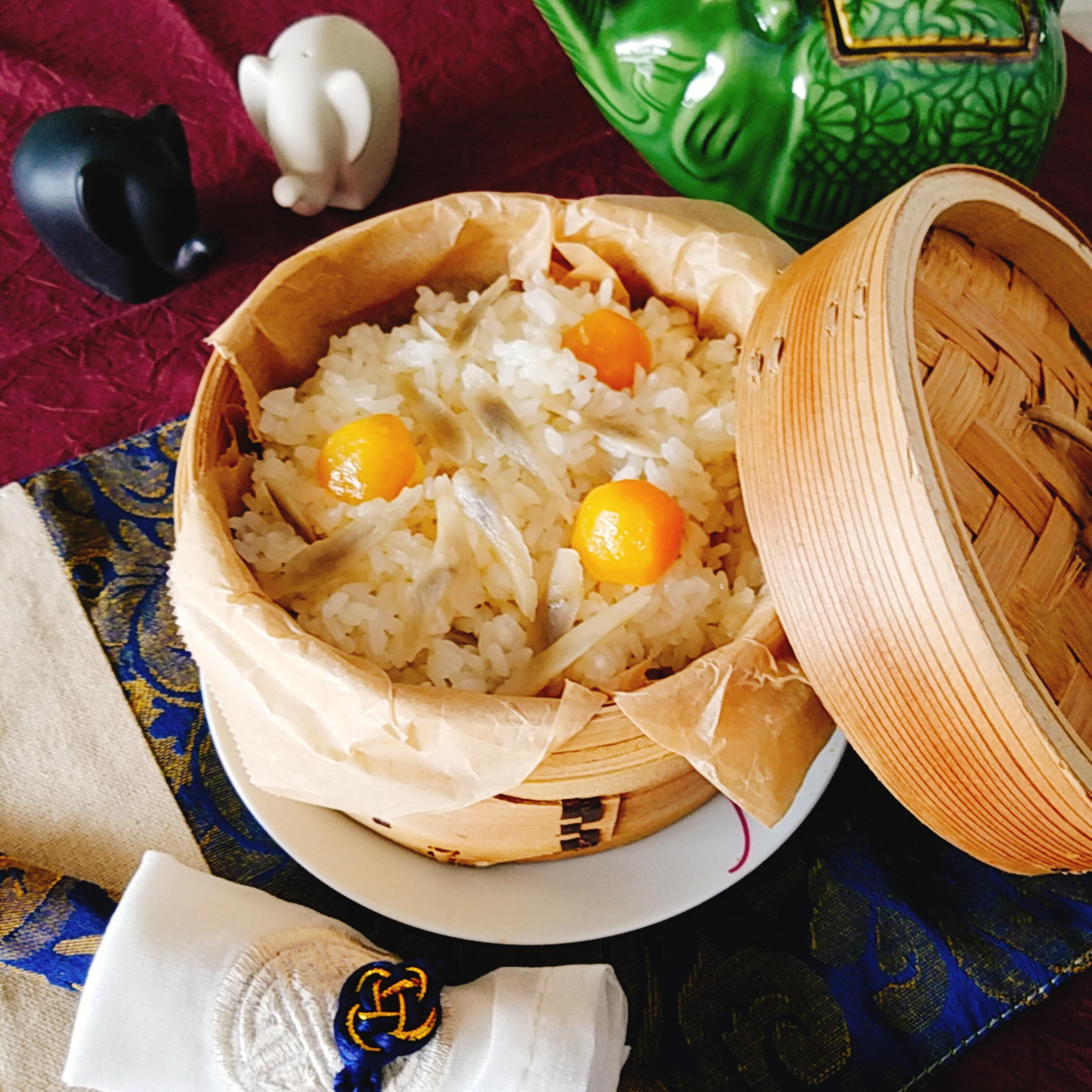 ② 炊き上がったらフライドごぼうを加えて混ぜ、上に栗をのせてフライドゴボウが柔らかくなるまで蒸らす。